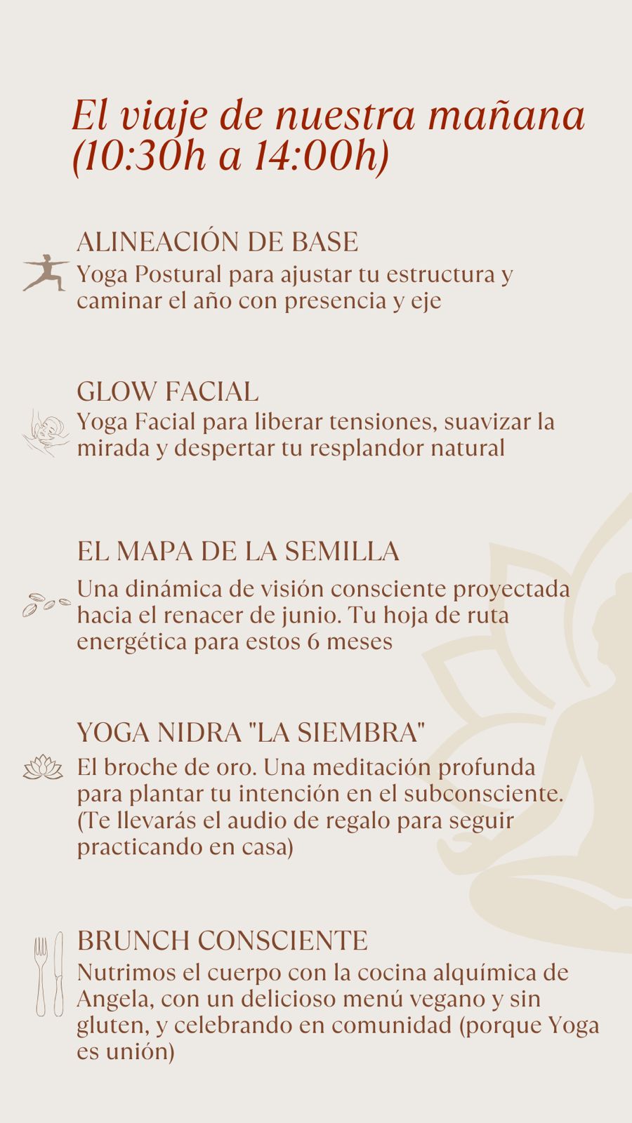 🥗 Brunch Consciente: Nutrimos el cuerpo con la cocina alquímica de Angela, celebrando en comunidad (porque Yoga es unión). Disfrutaremos su especial menú sin gluten y vegano